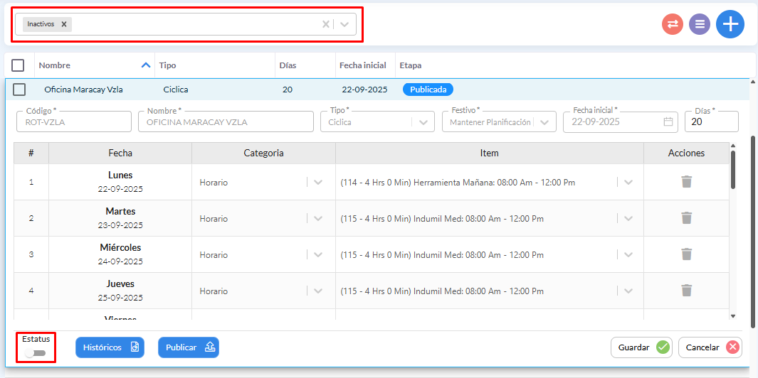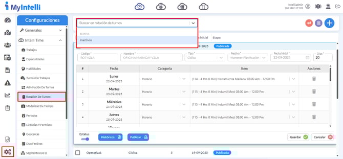 - Paso 1: Desde el módulo Rotación de turnos utilice el filtro de búsqueda donde colocara la palabra Inactivo.