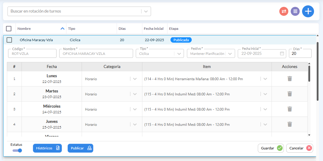 - Paso 4: Luego, haga clic sobre el botón Guardar para confirmar la activación de la rotación. Al realizar esta acción el registro deja de visualizarse entre la lista de registros inactivos.