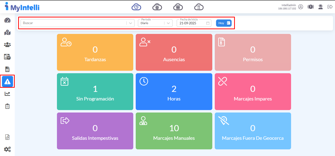 - Paso 3: Se muestran los registros de los empleados que presentan ausencias absolutas para la fecha consultada. En este caso, ubique el cursor en el filtro principal que se encuentra del lado izquierdo de la pantalla y seleccione al empleado filtrado desde el componente de búsqueda.