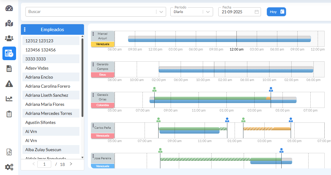 - Paso 1: Desde la vista Línea de tiempo del módulo Planificación ubique el componente de búsqueda que se encuentra en la parte superior izquierda de la pantalla para localizar el registro del empleado filtrando por: el estatus, nombres, apellidos, Nro. de documento o código del empleado, estructuras, grupos de personas, permisos, tipos de contratos y turnos de trabajos luego, seleccione al empleado en el filtro principal.