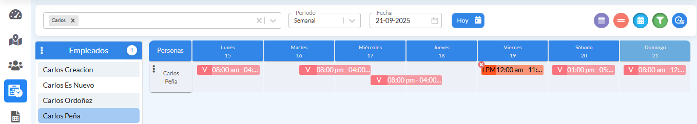 - Paso 5: Desde la lista de turnos seleccione y arrastre el turno hasta la fecha en que será asignado. Repita este paso para asignar turnos al resto de los días de la semana.