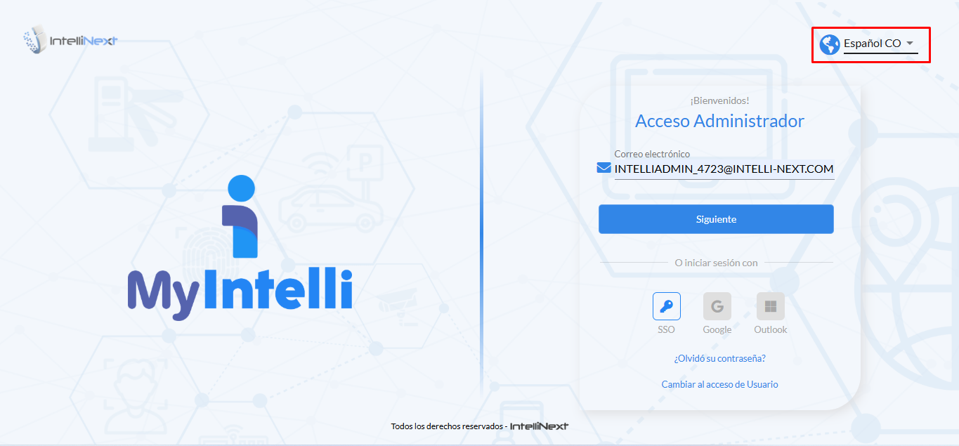 Desde la pantalla de login cuenta con la opción del cambio de idioma que le permitirá visualizar la información de esta vista en español Colombia, español Dominicana, español Venezuela e inglés, tenga en cuenta que este cambio solo aplica para la pantalla de login. A continuación, indicamos los pasos a seguir: