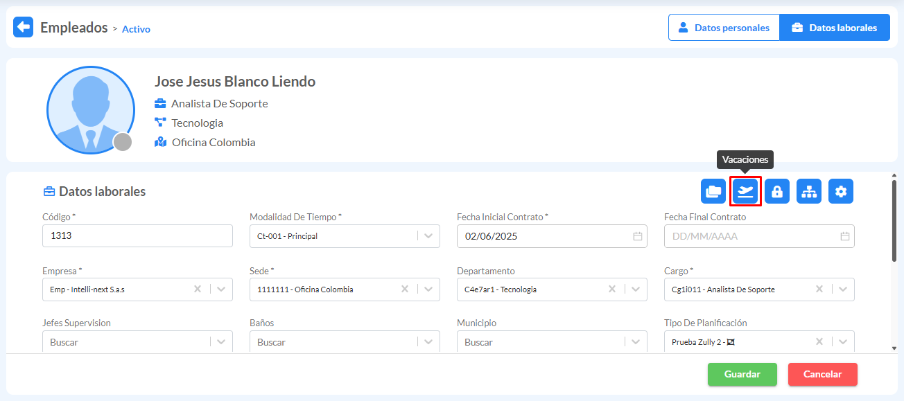 - Paso 4: Haga clic sobre el botón Vacaciones donde se muestra la pantalla con la información del empleado disponible.