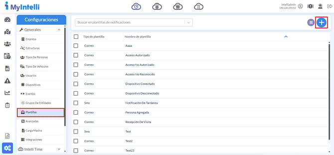 Al ingresar al módulo Configuraciones generales de MyIntelli, encontrará el módulo Plantillas desde donde podrá crear plantillas de textos para la notificación de eventos, realizando los siguientes pasos: