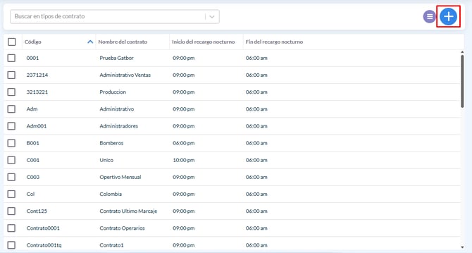 Desde el módulo Tipos de contratos se indicarán los parámetros con los cuales estará laborando el empleado definiendo los tiempos de recargos nocturnos, horas máximas a trabajar, manejo de límite de horas, horas extras, si trabaja sin horario, entre otros. Para crear un contrato realice los siguientes: