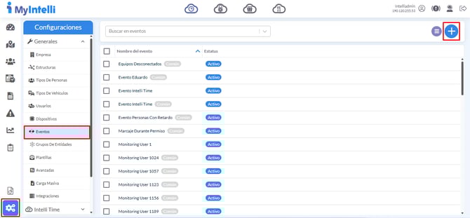Al ingresar al módulo Configuraciones generales de MyIntelli, encontrará el módulo Eventos desde donde podrá crear diferentes tipos de eventos en la plataforma, realizando los siguientes pasos: