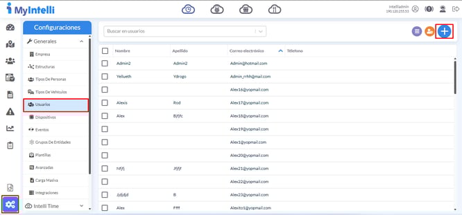 Al ingresar al módulo Configuraciones generales de MyIntelli, encontrará el módulo Usuarios desde donde podrá crear usuarios, realizando los siguientes pasos: