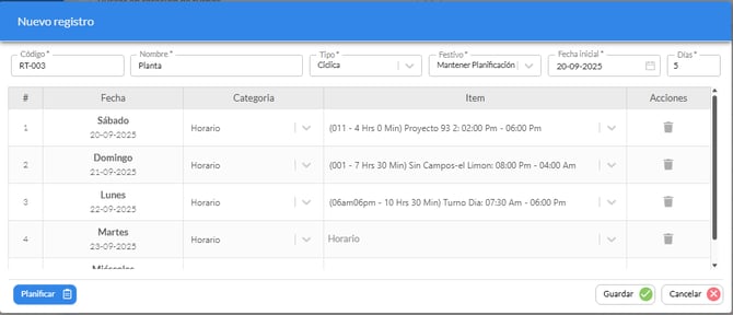 - Días: Campo requerido el cual, indica el número de días que aplicará la rotación de turno. Al indicar la cantidad de días se dibuja la siguiente tabla:
