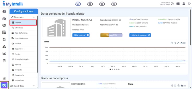 Al ingresar al módulo Configuraciones generales de MyIntelli, encontrará el módulo Empresa desde donde podrá realizar la edición de los datos de la empresa, siguiendo estos simples pasos: