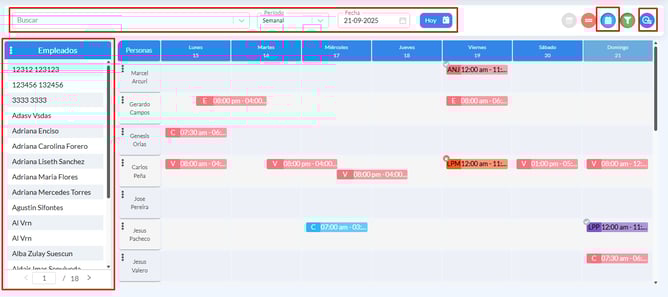 - Paso 2: Luego, ubique el componente de búsqueda que se encuentra en la parte superior izquierda de la pantalla para localizar el registro del empleado filtrando por: El estatus, nombres, apellidos, Nro. de documento o código del empleado, estructuras, grupos de personas, permisos, tipos de contratos y turnos de trabajos luego, seleccione al empleado en el filtro principal.