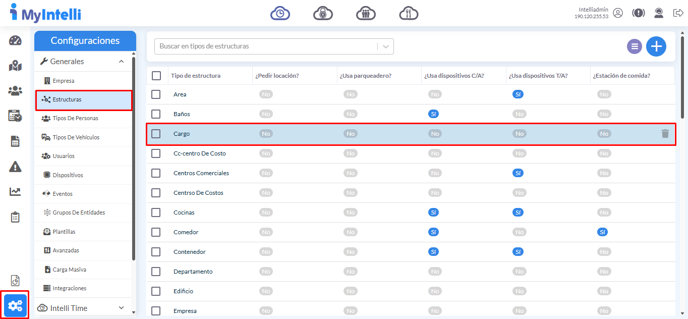 Al ingresar al módulo Configuraciones generales de MyIntelli, encontrará el módulo Estructuras desde donde podrá eliminar registros previamente creados, siguiendo estos simples pasos: