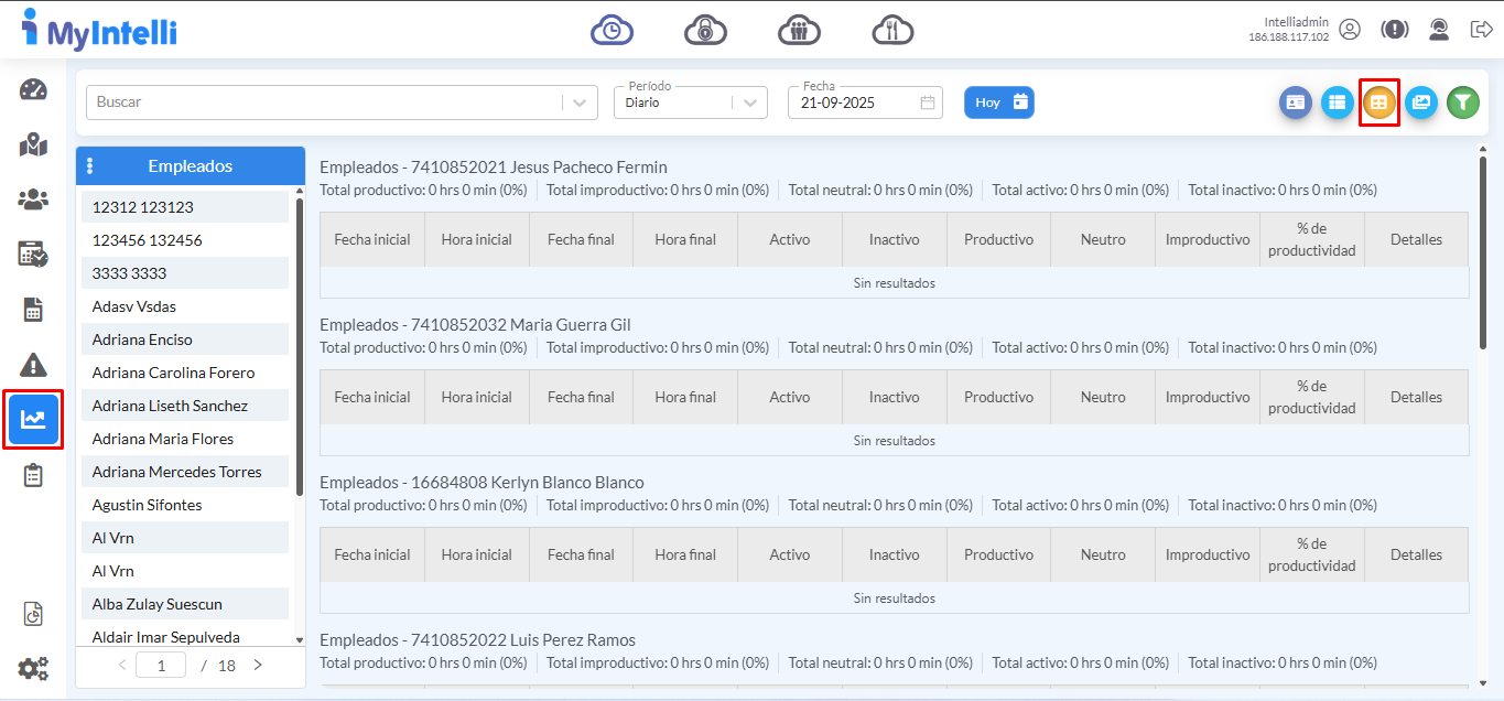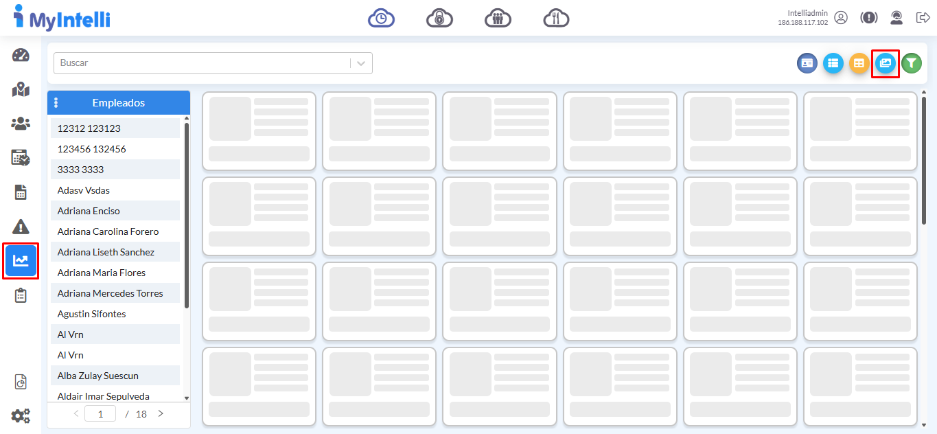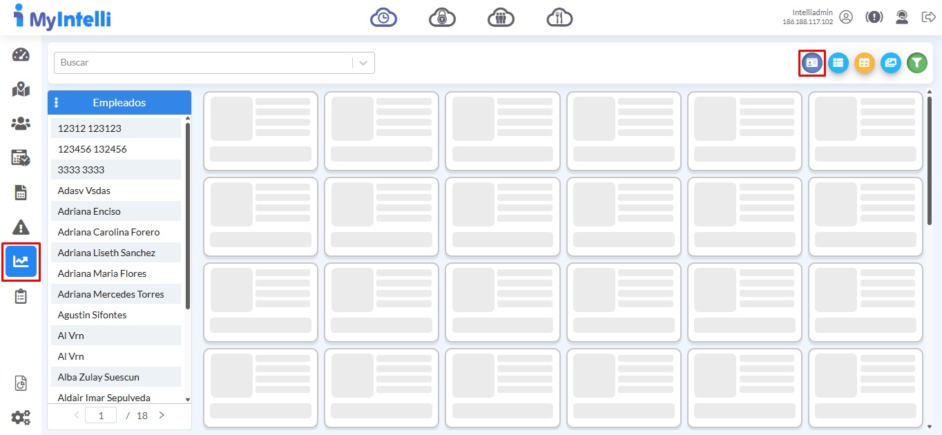 - Desde el panel principal del módulo ubique el icono Lista que se encuentra en la parte superior derecha de la pantalla y haga clic en él, lo cual lo llevará a la Vista Lista luego, ubique el registro del empleado que requiere consultar y haga clic sobre el registro para desplegar la ficha del empleado. Desde esta ficha tendrá disponible el botón Capturas de pantalla. Haga clic sobre este botón para desplegar la vista donde encontrará las tarjetas con las capturas en miniatura del empleado al que se le está realizando el monitoreo del trabajo remoto donde al hacer clic sobre una tarjeta en particular se amplía la captura para tener mayor detalle de la imagen.