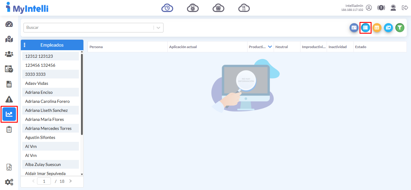 - Desde el panel principal del módulo de productividad, ubique el botón Captura de pantalla que se encuentra en la parte superior derecha y haga clic en él luego, se muestra el historial con las capturas de todos los empleados, ubique la tarjeta del empleado que requiera consultar y al hacer clic sobre la tarjeta se muestra la modal Captura de pantalla y para tener mayor detalle haga clic sobre la imagen.