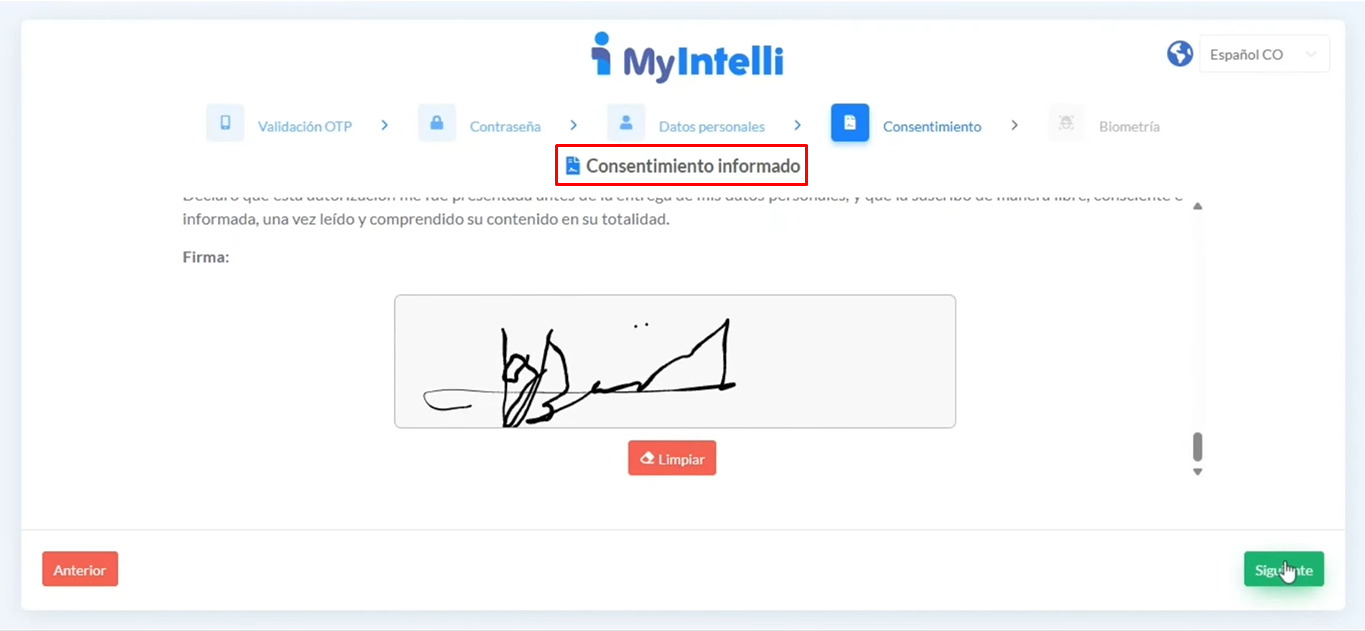 - Consentimiento Informado: se muestra el documento para que el empleado autorice la captura de sus datos biométricos, colocando su firma digital para realizar la aceptación de esta autorización.