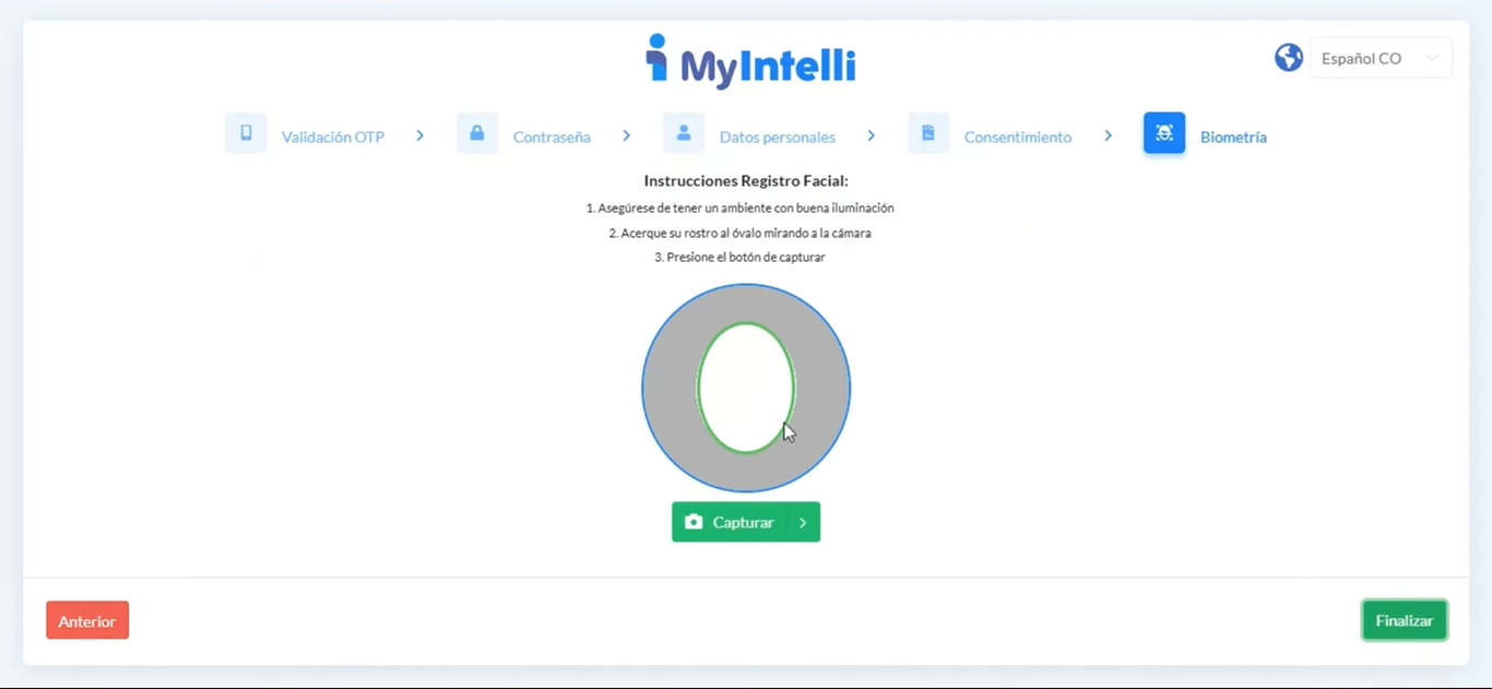 - Biometría: el empleado debe tomarse una fotografía para realizar el enrolamiento de su rostro, lo cual le permitirá acceder desde cualquiera de los métodos de marcajes que tenemos disponibles en MyIntelli, para realizar este proceso, haz clic en el botón Capturar y haz clic en el botón Finalizar. Con este procedimiento termina el proceso de Onboarding.