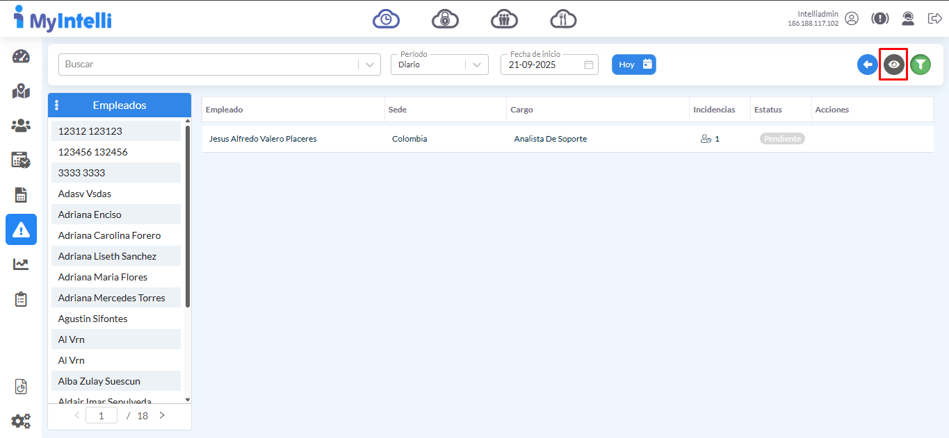 - Paso 3: Se muestran todos los empleados que presentan tardanzas para la fecha consultada. En este caso, ubique el cursor en el filtro principal que se encuentra del lado izquierdo de la pantalla y seleccione al empleado filtrado desde el componente de búsqueda.