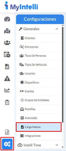 - Paso 2: Se muestra el acordeón Configuraciones donde debe hacer clic en Generales>Carga masiva.