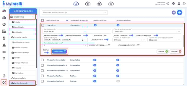 Debemos crear los perfiles de marcaje de computadora que se le asignan a los registros de los empleados para adjudicar los permisos para el uso Remote Web. A continuación, le mostramos cómo editar o crear nuevos perfiles de marcajes en la plataforma Myintelli: